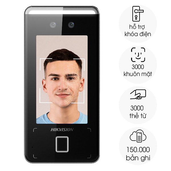 | Tính năng, hỗ trợ | – Thời gian nhận diện: <0.2s/user – Tối đa 1500 khuôn mặt, 1500 thẻ Mifare 1, 1500 vân tay và 150000 sự kiện. – Kết nối TCP/IP, ISUP5.0, ISAPI – Kết nối: USB, khoá điện, nút nhấn Exit, cửa, RS – 485. – Hỗ trợ chuẩn IP65 |